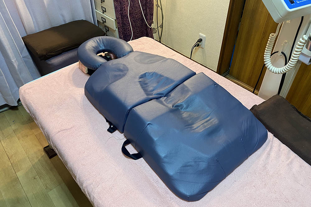 妊娠中でも安全に治療を受けていただけるよう、うつ伏せでも、おなかと胸が圧迫されない特殊なマットを用意しています。